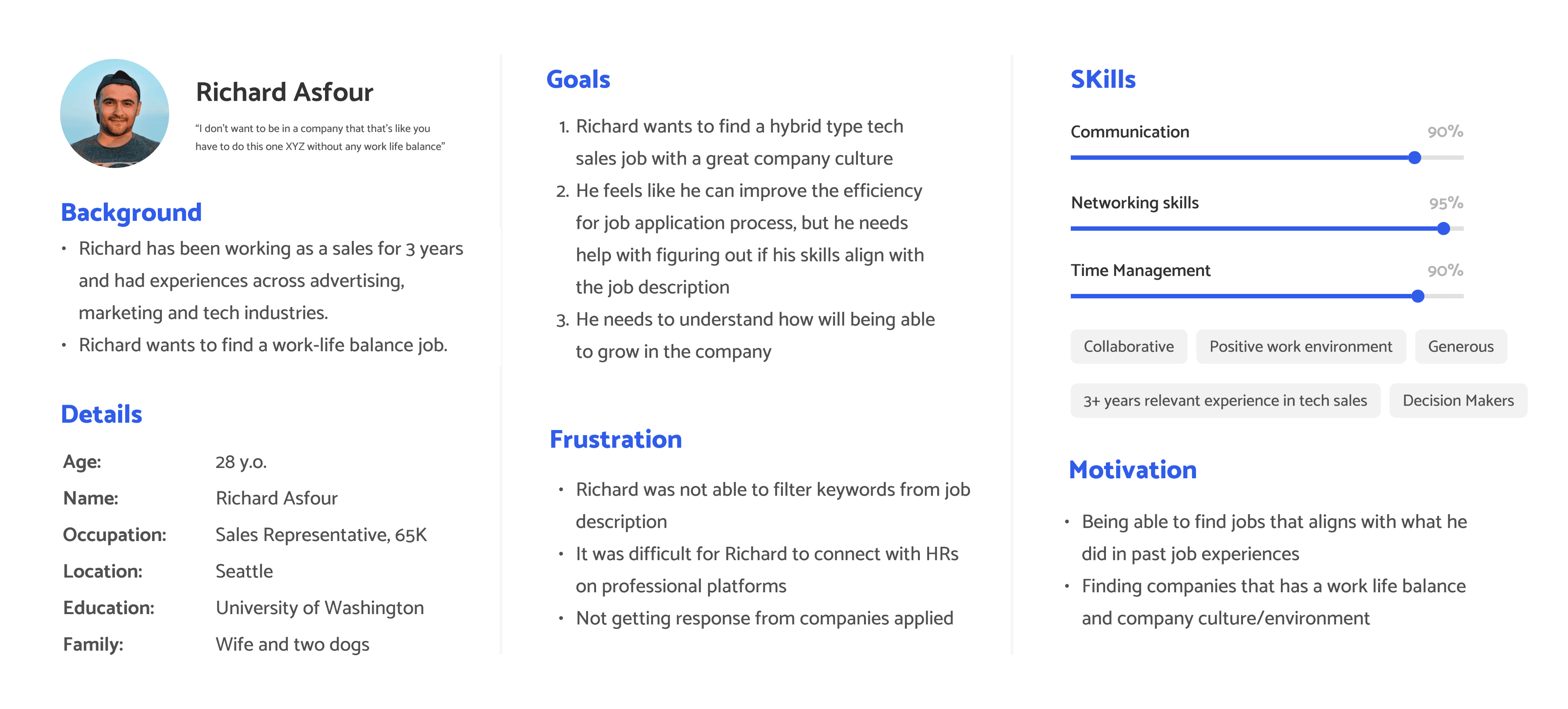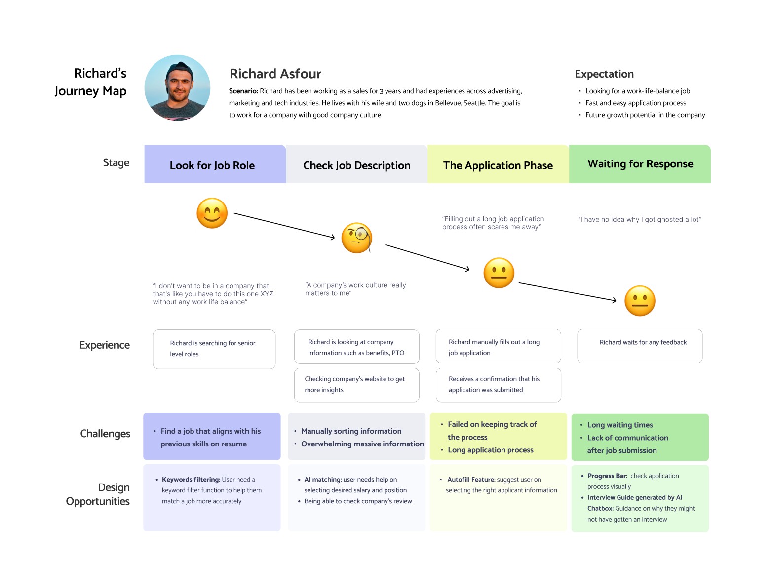 Immersed in UX research, I empathized profoundly with the diverse challenges users encountered throughout the job application process. This empathy became the guiding force, directing our efforts to create a solution that eased the frustrations arising from aligning job experiences with company preferences.