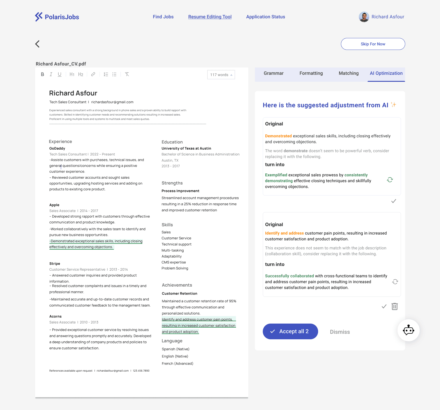 Categorized to Grammar, Formatting, Job keywords matching, and AI rephrasing